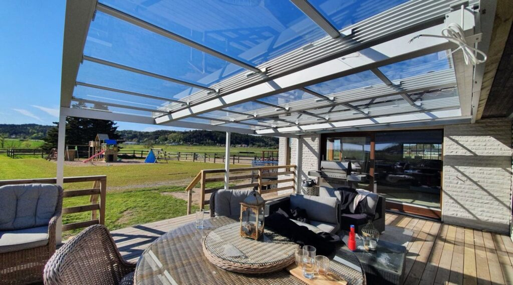 På bilden ovan är skärmtaket monterat högre upp än ränndalen på husets tak. På så vis får vi upp höjden och bygger en exklusiv känsla. När skärmtaket dras tillbaka till sitt ursprungliga läge syns endast takbalkarna och en hörnstolpe — i stort sett likadant som en traditionell rejäl markis med skenor.